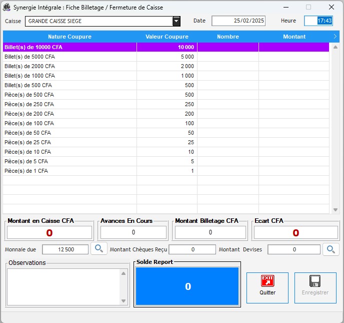Fiche Billetage / Fermeture de Caisse