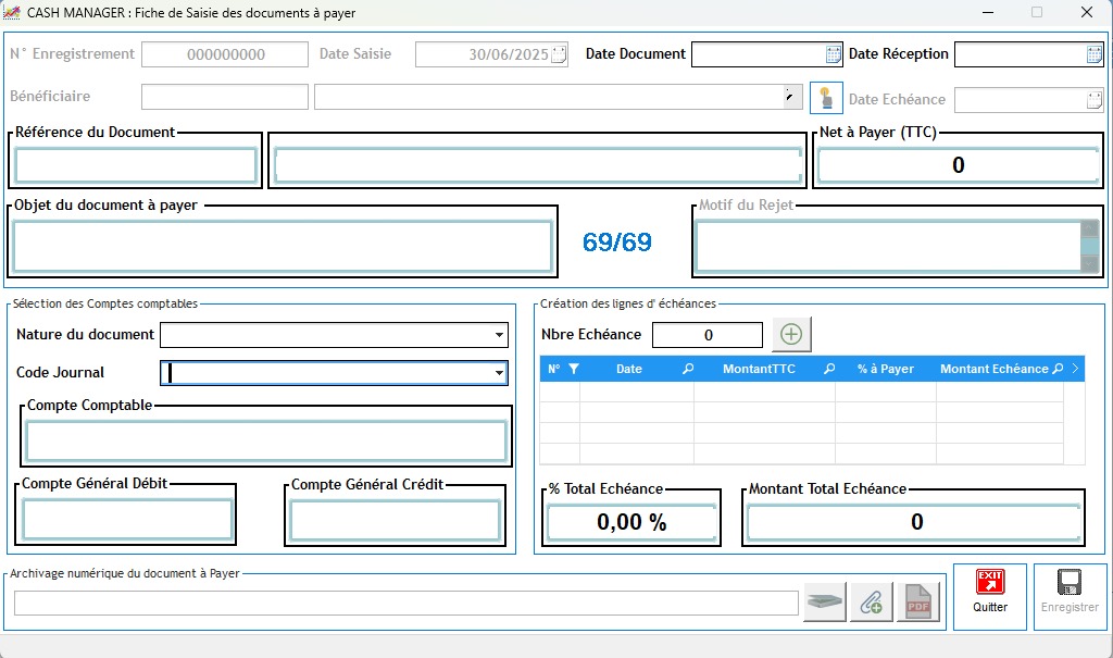 CASH MANAGER est une application de gestion et sécurisation de flux de trésorerie. Elle permet de gérer et de centraliser l’ensemble des décaissements et des encaissements (chèque, traite, virement, espèces, etc). CASH MANAGER est composée des modules suivants :