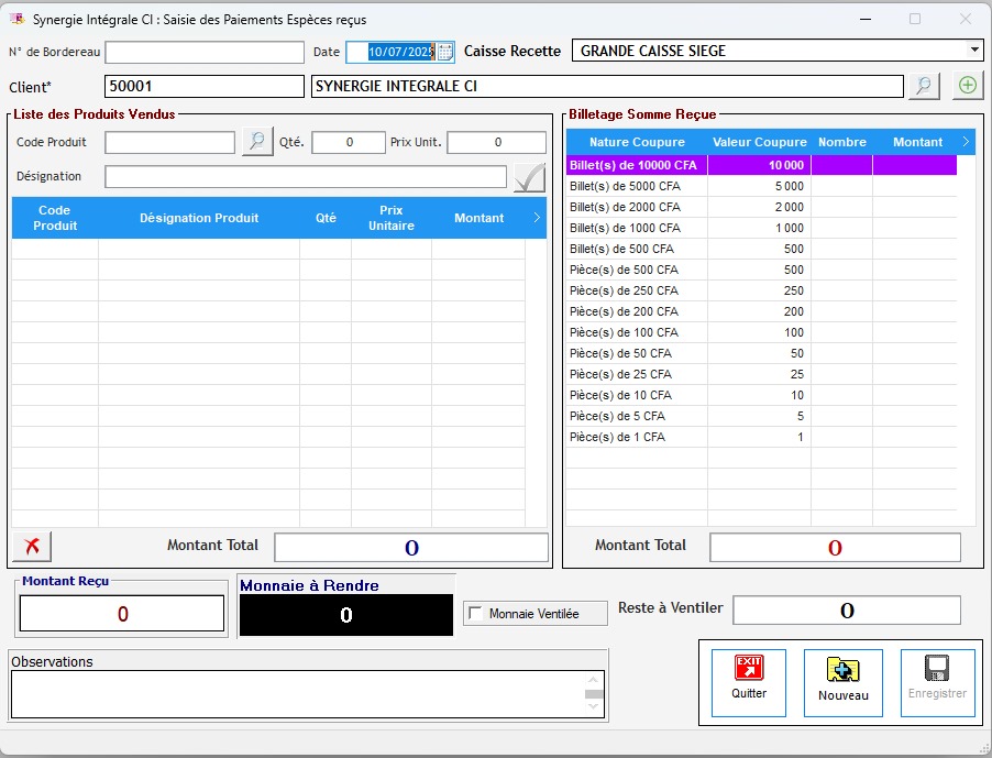 Fiche de Saisi des paiement espèces reçus