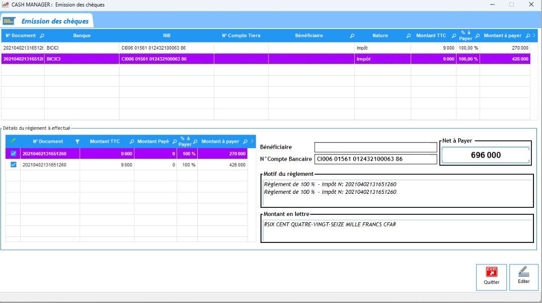 - une automatisation de la traduction des montants en lettre sur les chèques et ordres de virements ;